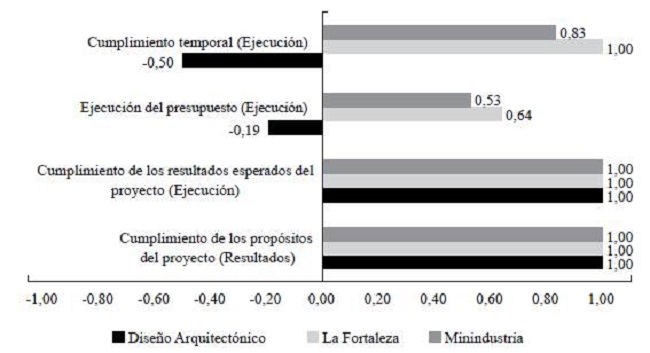 Aunque los tres casos estudiados cumplen totalmente con los propósitos y resultados esperados, según lo formulado en el diseño de la matriz de marco lógico del proyecto, la ejecución del presupuesto se cumple en 19 % en la Minindustria, debido a variaciones entre el nivel de precios estimados en el estudio de factibilidad y los precios a los que realmente se adquiere la tecnología. En el caso de la Fortaleza y Diseño Arquitectónico, la ejecución apenas alcanza valores del 64 % y 53 %, respectivamente, lo que tampoco es un resultado favorable, debido a irregularidades con los procesos de importación previstos.