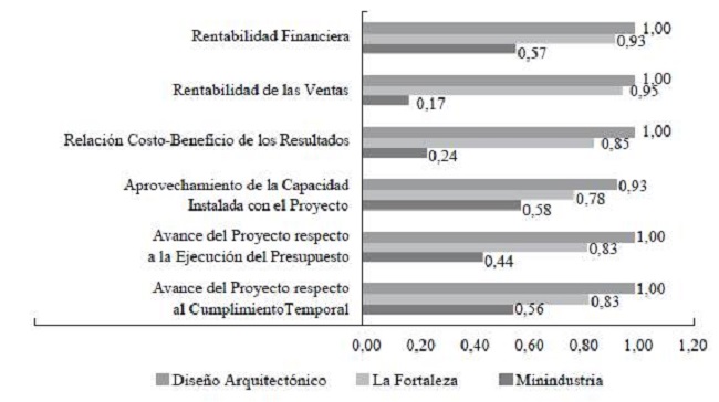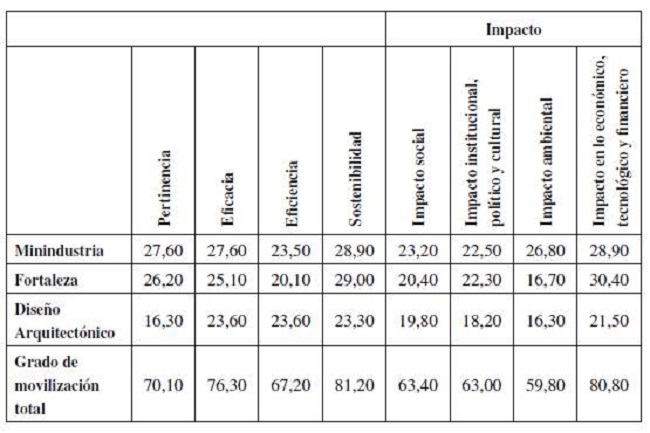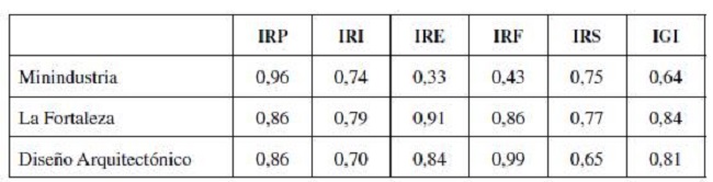 Al observar la Tabla 1, es posible precisar que la Fortaleza obtiene el mayor índice global de impacto (IGI), dado que logra un resultado más uniforme en todos los índices relativos, entre valores medios y altos. Le sigue Diseño Arquitectónico, que muestra los resultados más desfavorables en su sostenibilidad. Por último, la Minindustria se afecta sensiblemente en su eficacia y eficiencia.