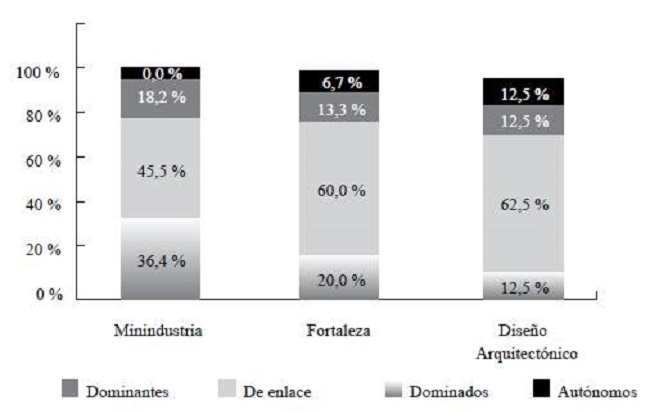 El valor del índice relativo de eficacia (IRE) resulta ser bajo (0,33) para la Minindustria; alto (0,91) para la Fortaleza; y medio (0,84) para Diseño Arquitectónico (Figura 5).