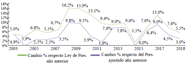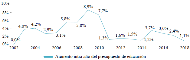 Debido al aumento de recursos realizado durante la ejecución anual y su comparación con el incremento de los presupuestos aprobados por el Parlamento para el año siguiente (figura 2), el incremento presupuestario interanual es menor, al considerar los aumentos de recursos intraanuales registrados. Entre 2002 y 2018 el presupuesto sectorial de educación creció, en promedio, el 8,5 %, comparado con el aprobado para el año anterior.