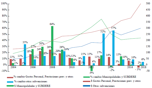 Este gasto se asocia a la iniciativa de la nueva organización institucional de la educación escolar pública, que comienza a implementarse gradualmente a partir de 2018; de igual forma, el gasto dirigido a municipalidades y Subdere tiene menores modificaciones intraanuales hacia el fin del periodo. Sin embargo, desde 2014, los montos totales planificados en la Ley de Presupuestos disminuyen, producto del aumento del gasto en recursos orientados a los establecimientos (prioridad de fortalecimiento de la educación pública). Otras subvenciones (que corresponden a recursos para la educación preescolar) aumentan en grado importante en la Ley de Presupuestos de 2015; además tienen significativas modificaciones intraanuales en 2014 y 2015, lo que refleja los cambios de gobierno y de sus prioridades.