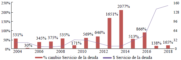 El ítem "Servicio de la deuda" se incluye siempre durante la ejecución de los presupuestos (figura 11), dado que los montos asignados por ley de presupuestos se incrementan durante el año de ejecución entre tres y seis veces para el periodo 2007-2012, y sobre quince veces en 2013 y 2014. A partir de 2017, se registra un aumento importante de su gasto planificado, pero se mantienen los aumentos de presupuesto durante el año que superan el 100 % de reajuste.