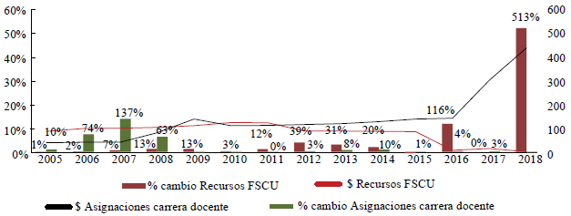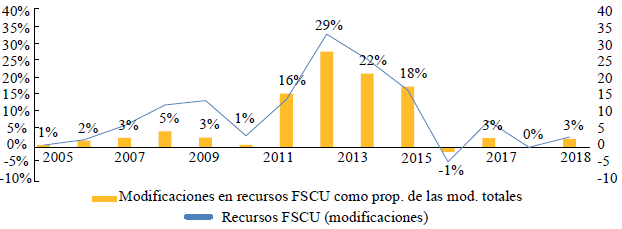Los recursos para el FSCU (figura 12) son prácticamente constantes en 2005- 2015, a partir de esa fecha disminuyen. Entre 2005 y 2015, se registran modificaciones al alza de recursos. En 2016 y 2018, hay mayores alzas intraanuales, coincidente con los años en que el presupuesto aprobado es menor. Por su parte, las asignaciones por carrera docente crecen, en primer lugar, en 2008 y 2009, luego se mantienen mayormente constantes y, posteriormente, crecen en forma sustantiva a partir de 2017. Esto se asocia a la nueva política de desarrollo profesional docente. Sin embargo, las mayores modificaciones intraanual en este gasto se inician en 2006 (año de importantes movilizaciones estudiantiles) y terminan en 2008.