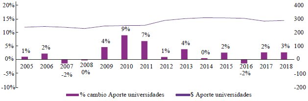 Finalmente, entre los gastos que tienden a aumentar durante el año, está el aporte basal a las universidades del CRUCH (figura 13). Esta contribución es casi constante en todo el periodo, pese a los cambios en la educación superior, en 20052018, sus transformaciones son menores: los mayores incrementos del presupuesto basal corresponden a 2010-2011 (7-9 % de aumento del presupuesto durante el año de ejecución).