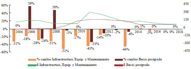 En cuanto a las becas de postgrado, su presupuesto solo se incrementa de forma importante a partir de 2009 y disminuye en 2015. Se establecen reducciones significativas intraanuales en este ítem los años 2007 (24 %) y 2011 (33 %). Por otro lado, existen aumentos intraanuales en 2006 y 2008 (sobre 50 %). Sin embargo, en general se trata de un gasto que ha tendido a disminuir en sus cambios (figura 14).