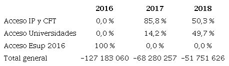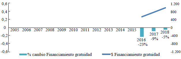Sin embargo, dos partidas que se reasignan a la baja son muy importantes. La "Gratuidad de la educación superior", presente solamente en los últimos tres presupuestos. Su monto era inicialmente difícil de estimar pues había antecedentes muy parciales para realizar esta tarea18. Sin embargo, se trata de reducciones financieras importantes, que aportan muchos recursos a otras políticas, lo que sería necesario indagar. Esta reducción también ha sido progresivamente menor, lo que muestra que este proceso se habría ido ajustando a través del tiempo.