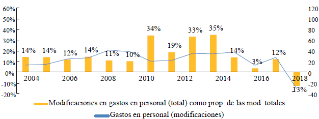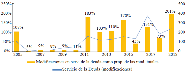 En relación con los ítems de gasto que durante el año de ejecución tienden a aumentar, las modificaciones en la categoría "Servicio de la deuda" (figura 3) son más importantes desde 2011. Entre 2001 y 2018, tales cambios muestran una magnitud similar o mayor a la modificación total del presupuesto del ministerio, en el año (excepto 2015 y 2017). En 2018, el aumento intraanual representó el 201 % de la reasignación total (absoluta) de recursos del ministerio en esa condición.