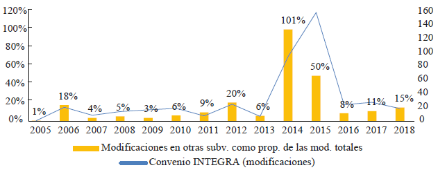 La categoría "otras subvenciones" corresponde prácticamente en su totalidad (98%) a recursos destinados a la operación de la Fundación Integra (entidad pública dedicada a educación parvularia). Para los años 2014 y 2015, se registra un aumento importante de los recursos intraanuales en este ítem (figura 4). Cambios que responden a la prioridad que otorgó el segundo gobierno de Michelle Bachelet (2014) a ese nivel de enseñanza.
