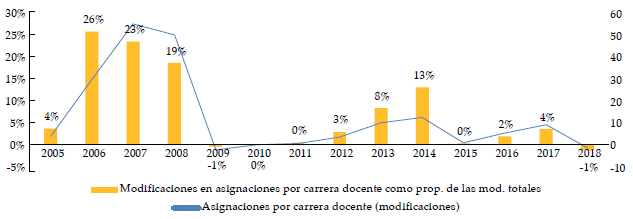 En el ítem "Gastos en personal, prestaciones previsionales y otros" (figura 7), el 81 % de las modificaciones corresponde a gastos en personal. Los recursos asociados a esta partida se han mantenido relativamente constantes en el periodo (disminuyen en 2018). El impacto mayor fue en 2011-2014, por las menores modificaciones totales. Finalmente, las asignaciones por carrera docente (figura 8) tienen un mayor impacto en el periodo 2006-2008.