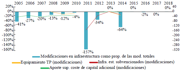 Sin embargo, el gasto en infraestructura, que se encuentra en todo el periodo de estudio, y por lo general es modificado hacia la baja intraanual, tratándose de una partida muy importante y políticamente muy significativa, lo que hace complejo el debate acerca de su eventual reducción, destaca que salvo situaciones puntuales, se sobreestime su magnitud, pues, por lo general, es altamente previsible su desempeño y además hay antecedentes históricos sólidos sobre sus costos en sus diversos formatos de operación. Ello implica que debería revisarse en detalle esta situación, pues entrega recursos importantes al Ministerio para redirigirlos hacia otras políticas.