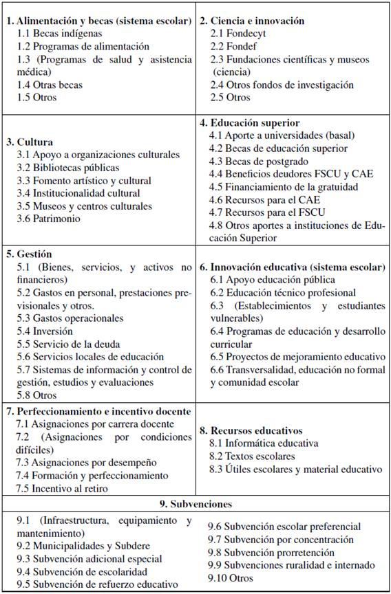 Para hacer comparable el gasto en educación en periodo estudiado, se clasificaron los ítems de gasto en nueve categorías y 56 subcategorías (tabla 1). Todas las cifras financieras se actualizaron a pesos chilenos (CLP $) de 2018, de acuerdo con los procedimientos del Banco Central de Chile.
