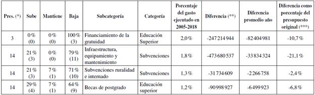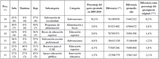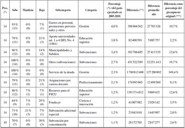 En esta sección, se analiza el comportamiento de las modificaciones presupuestarias para el periodo 2005-2018, en las veinte categorías más importantes en las que se clasificó el gasto en educación (que representan el 89 % del gasto total del período), organizadas en tres tipos de gasto: (1) los que aumentan -diez categorías-, (2) los que disminuyen -cuatro categorías-, y (3) los que no tienen un comportamiento definido o claro -seis categorías.