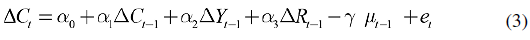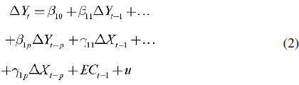 Donde los valores Aindican primeras diferencias y representan lo que ocurre en el corto plazo; los subíndices t-1 son los rezagos de las variables; y es el coeficiente de la ecuación de cointegración y es el residuo de la regresión (1) retardado un periodo.