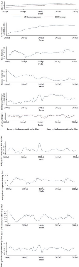 La Figura 1 muestra las variables consideradas en el estudio. A partir de la imagen de arriba a la izquierda se observa una tendencia creciente y muy parecida entre el logaritmo real del consumo y del ingreso disponible.