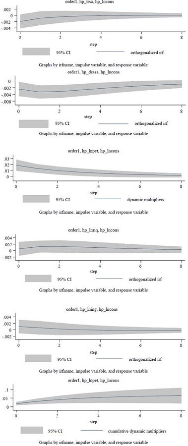 Por tanto, el orden seleccionado es el siguiente: hp_trsa, hp_lnriq, hp_dessa, hp_ lning, hp_lncons. Se observa que un shock a la tasa de interés, imagen de arriba a la izquierda, a la riqueza, imagen de arriba a la derecha y al ingreso disponible, imagen de la segunda fila a la derecha, no tienen efectos estadísticamente significativos, si se considera un intervalo de confianza del 95 %. De hecho, el área sombreada engloba el valor cero en estos casos para todo horizonte temporal.