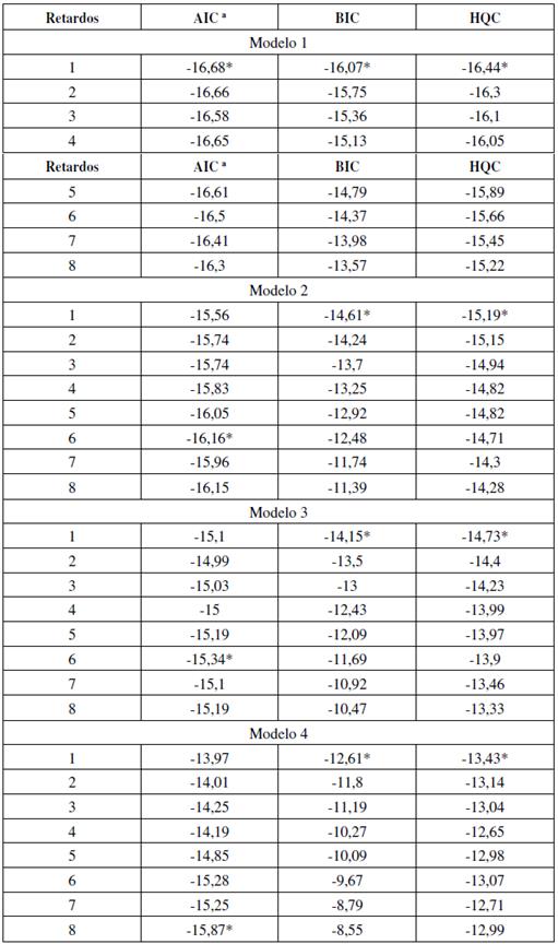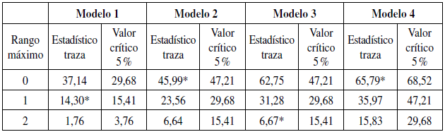 La Tabla 3 muestra los resultados de las pruebas de cointegración de Johansen, considerando el estadístico de la traza. Entonces, el primer modelo es el único que presenta un único vector de corrección de errores, al nivel de confianza del 95 %. Al contrario, los modelos 2 y 4 no presentan cointegración; mientras que el modelo 3 tiene dos vectores de corrección de errores.