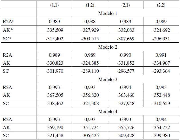Entonces, solo se cuenta con cuatro posibilidades: usar un adelanto y un rezago (1,1), un adelanto y dos rezagos (1,2), dos adelantos y un rezago (2,1) y dos adelantos y dos rezagos (2,2).