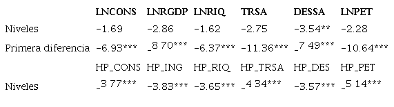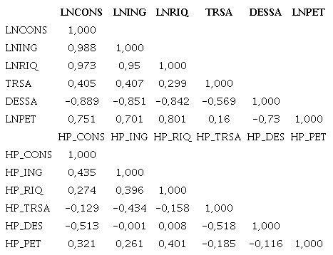 La Tabla 1 representa la matriz de correlaciones entre las series. Allí, se observa que existe una correlación alta y positiva entre los logaritmos del consumo, el ingreso disponible, la riqueza y el ingreso petrolero, lo cual está en línea con lo esperado. Sin embargo, existe una relación positiva de la variable dependiente con respecto a la tasa de interés. Pero ello no acontece cuando se considera el componente cíclico de la serie. Mirando el valor negativo asociado al desempleo, puede deducirse que un mayor nivel de este es congruente con menores niveles de consumo. En general, las variables obtenidas con el filtro de Hodrick y Prescott tienen correlaciones más bajas.