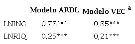 La Tabla 4 muestra los resultados de largo plazo de las estimaciones ARDL y VEC, usando MCOD y máxima verosimilitud, respectivamente. Se observa, entonces, que los valores varían muy poco entre modelos. En particular, el logaritmo del ingreso lleva un estimador puntual de 0,78 en el primero de estos (ARDL) y 0,85 en el segundo (VEC). Por lo que se refiere a la segunda variable explicativa, la riqueza, el coeficiente es de 0,25 en el primer caso y 0,21, en el segundo. Los coeficientes estimados son todos estadísticamente significativos al nivel de confianza del 99 %.
