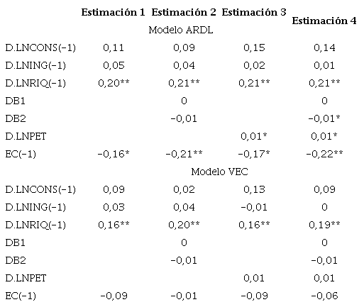 El término de corrección de errores rezagado un periodo resulta significativo en las estimaciones dos y cuatro del modelo ARDL. Sin embargo, es discutible la exogeneidad débil de las variables regresoras, dado que el vector de corrección de errores resulta estadísticamente significativo, con un nivel de confianza del 99 % en las demás ecuaciones del modelo VEC. La ausencia del requisito de exogeneidad débil conlleva que los resultados del modelo ARDL no sean confiables. Por otro lado, no existe cointegración, considerando los resultados del modelo VEC, puesto que el término de corrección de errores nunca es diferente de cero.