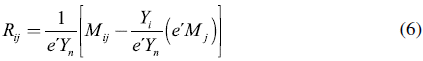 Donde e es un vector de unos de orden (Nx1). El elemento Rij establece el signo y la magnitud de un cambio en el ingreso relativo de la cuenta i cuando a la cuenta j se le inyecta un flujo exógeno de ingreso. Una expresión del elemento Rij es la siguiente: