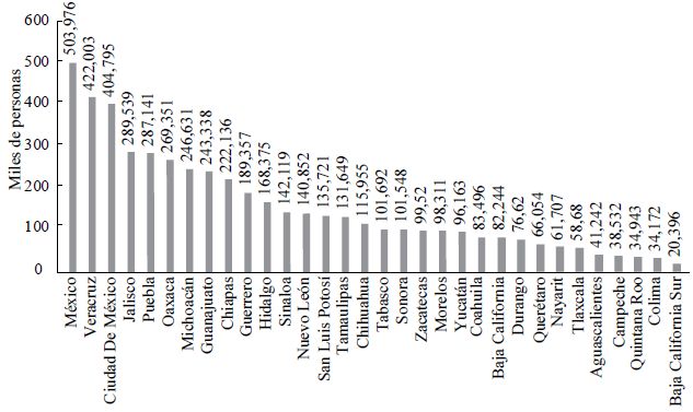 Para el bimestre noviembre-diciembre 2018, el número de beneficiarios del programa determinado por la Secretaría de Bienestar ha sido de 5 008 258 adultos mayores. La Figura 1 muestra la distribución de la población atendida en el país, donde se observa que ocho entidades concentran más del 50 % de esta: Estado de México, Veracruz, Ciudad de México, Jalisco, Puebla, Oaxaca, Michoacán y Guanajuato.