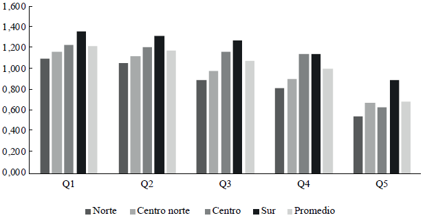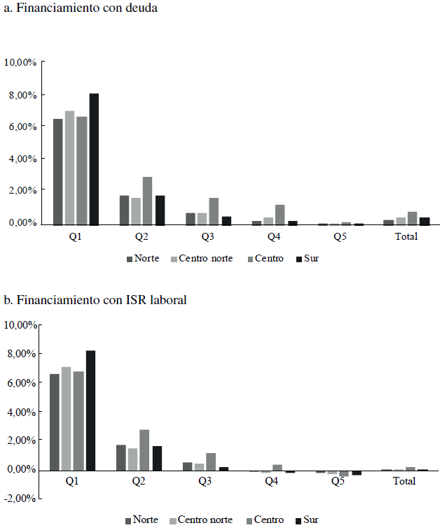 La región sur de México es donde, en términos proporcionales, se mejora más al primer quintil (8,24 %), financiando con deuda; y 8,35 % financiando con ISR laboral (el primer quintil de ingreso goza de un subsidio al ingreso laboral). Ello se debe a que es la región con los más altos efectos expansivos (Figuras 2 y 3) y, además, el impacto inicial del cambio en el PBPAM en esta región se concentra en el primer quintil (Tabla 5).