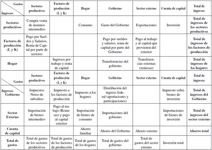 Una matriz de contabilidad social (MCS) es una tabla de doble entrada que incorpora las relaciones de ingreso-gasto entre los diversos agentes económicos (familias, sectores productivos, Gobierno y sector externo) que participan en un área geográfica para un período específico. Las MCS muestran el flujo circular de la renta de forma matricial, por lo que representan una descripción del comportamiento de una economía. La Tabla 1 muestra la estructura de una MCS, en ella se reflejan todos los ingresos (filas) y todos los gastos (columnas) de cada agente económico, en una región y año específicos.