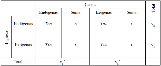 En la Tabla 2, se incluye una representación de las relaciones entre las cuentas exógenas y endógenas, tomada de Defourny y Thorbecke (1984).