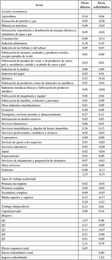 Tercero, la importancia de sectores como el comercial y de servicios en la expansión de la economía. Cuarto, la existencia de mayores efectos expansivos de inyecciones exógenas en los hogares pobres sobre el ingreso de la economía, ante la posibilidad de mayores propensiones medias al ahorro en los hogares más ricos. Quinto, los efectos desiguales en el ingreso de los hogares ante inyecciones exógenas, en específico, mayores incrementos en el ingreso de los hogares más ricos, con respecto a los más pobres, debido a que estos hogares son los dueños de los factores de producción utilizados en las distintas actividades.