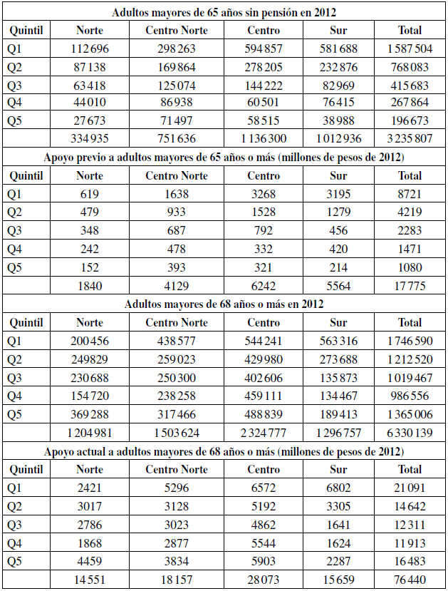 Para aproximar el cambio en el apoyo otorgado, basándonos en los resultados de la ENIGH 2012, se procedió de la siguiente manera. Para aproximar la situación previa se identificó la cantidad de adultos mayores de 65 años o mayores que no contaban con una pensión por quintil y región7; enseguida, se le aplicó el monto del apoyo a precios constantes de 2012, que asciende a 9l6 pesos cada dos meses. Asimismo, para aproximar la situación actual se identificó la cantidad de adultos mayores de 68 años o mayores, independientemente de que tuvieran jubilación o pensión y, a dicha cantidad, se le aplicó el monto del apoyo otorgado a partir de 2019 a precios constantes de 2012, que asciende a 1006 pesos mensuales.