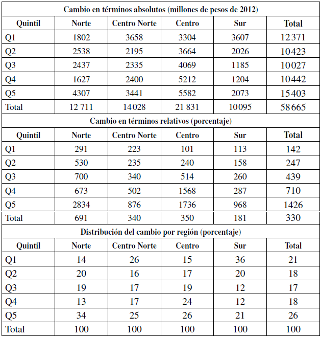 De esta forma, para aproximar el cambio en el monto de apoyo entregado por quintiles y regiones, se calcula la diferencia entre el cálculo del monto de apoyo, siguiendo las reglas de operación actuales y el monto de apoyo bajo las reglas de operación previas8. Los resultados se encuentran en la Tabla 5, tanto en términos absolutos como en términos relativos. Puede observarse que las nuevas reglas de operación generan un incremento en el apoyo de alrededor de 58 665 millones de pesos de 2012, lo que representa un aumento de 330 % en relación con el monto anterior9.