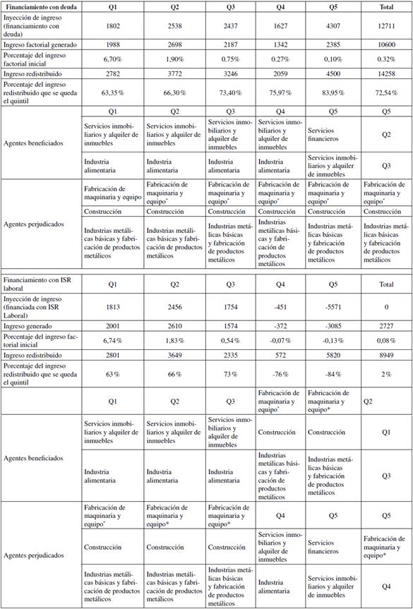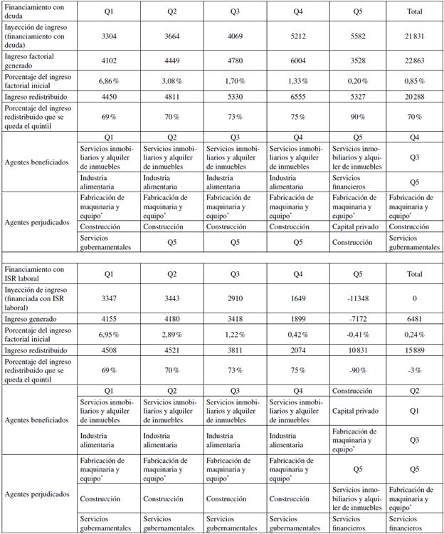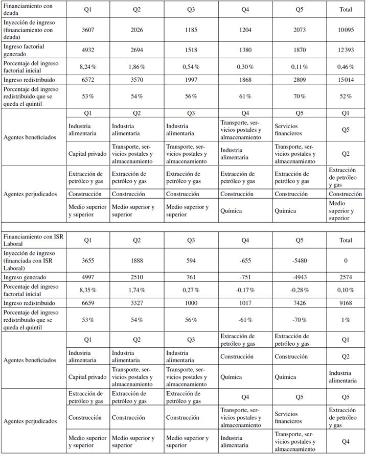 Para observar los posibles efectos expansivos y redistributivos del cambio en la política pública, se llevan a cabo dos simulaciones: (1) el aumento en el presupuesto dedicado al programa se financia con deuda -escenario 1- y (2) el aumento en el presupuesto se cubre con un incremento en el Impuesto Sobre la Renta laboral (ISR laboral), esto es, asumiendo que el aumento en el presupuesto se distribuye por quintiles según como el pago del ISR laboral lo hace en las MCS regionales10 -escenario 2. Cabe comentar que, en el escenario 2, debido a la progresividad del ISR laboral, en neto (por ejemplo, ver Ramírez, 2020), el efecto inicial es positivo para los primeros tres quintiles; y es negativo para el cuarto y quinto quintiles. Esto es cierto para todas las regiones, con excepción de la región centro, donde solo el quintil de mayor ingreso tiene impacto negativo (Tablas A1-A4).