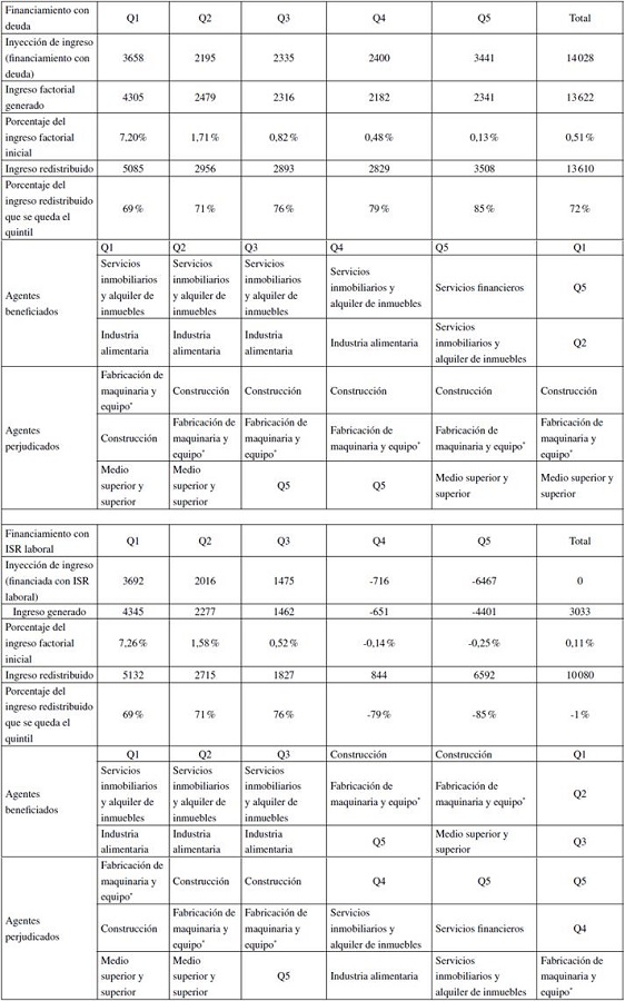 En términos de los efectos redistributivos, los sectores institucionales beneficiados y perjudicados varían según el tipo de financiamiento, el quintil de ingreso y la región. En el agregado regional, en el escenario de financiamiento con deuda, el quinto quintil es uno de los tres sectores institucionales más beneficiados para todas las regiones, debido a que concentra una alta porción del presupuesto adicional. Por el contrario, los perjudicados tienen importante participación en la economía regional, pero no proveen bienes o servicios para los hogares, sino que venden bienes de inversión o están orientados a la exportación, como construcción y fabricación de maquinaria y equipo. Bajo el escenario de financiamiento con ISR laboral, debido a la progresividad del impuesto, los hogares más pobres son los más favorecidos; mientras que los afectados son similares al escenario de financia-miento con deuda.