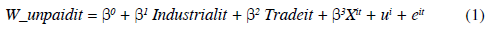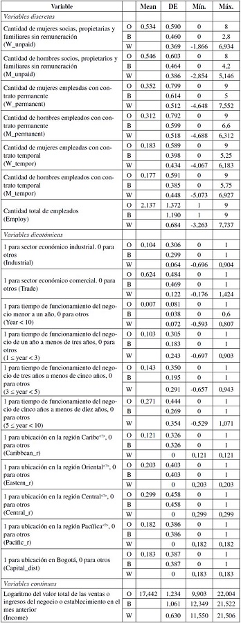 Las variabilidades "overall" y "within" son calculadas a partir de 108 695 datos de microempresas por año; mientras que la variabilidad "between" es calculada sobre 21 739 microempresas; además, el promedio de años en el que las unidades económicas fueron observadas es cinco. La cantidad de mujeres socias, propietarias y familiares sin remuneración (W_unpaid) varía globalmente entre 0 y 8; el promedio de dicha cantidad en cada firma oscila entre 0,0 y 2,8; mientras que la desviación del promedio de cada microempresa varía entre -1,866 y 6,934.