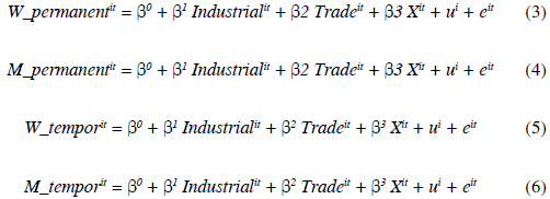 Para identificar la segregación ocupacional de género, según el tipo de empleo, se estiman seis ecuaciones en total. Al contrario de la ecuación 1, la segunda procura medir la contribución de los sectores económicos a la cantidad de hombres empleados sin remuneración. De igual manera, las ecuaciones 3 y 4 intentan lo mismo que la 1 y la 2, pero con respecto a la cantidad de mujeres y hombres empleados con trabajo permanente, respectivamente. Así, el quinto y el sexto modelo econométrico permiten analizar si los sectores económicos explican la cantidad de mujeres y hombres empleados con trabajo temporal (ecuaciones 5 y 6).