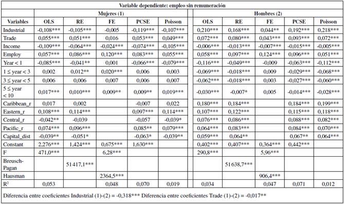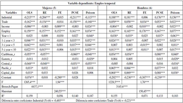 Al igual que en el caso del trabajo no remunerado, la estimación del modelo PCSE muestra que las actividades industriales tienen una relación inversa con el trabajo femenino (-0,286) y positivo con el masculino (0,223). El sector comercial sigue presentando una relación positiva para los hombres (0,127), pero, a diferencia del empleo sin pago, negativa para las mujeres (-0,149). Mientras los hombres son preferidos en el trabajo permanente para las labores industriales y comerciales, las mujeres solo son favorecidas en las firmas de servicios.