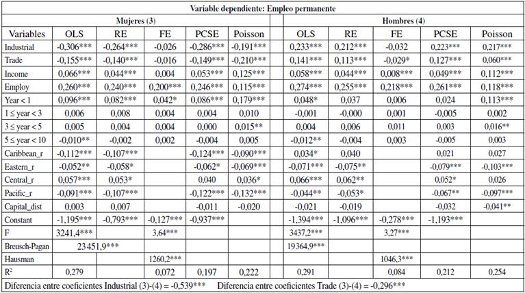 En cuanto al empleo permanente y contratación a largo plazo, las estimaciones de la Tabla 3 muestran que las variables de interés relativas a la industria y el comercio son estadísticamente significativas (90-99 % de confianza para todos los modelos, a excepción del de efectos fijos para las mujeres). Los sectores económicos contribuyen al empleo permanente de ambos géneros, pero de manera opuesta.