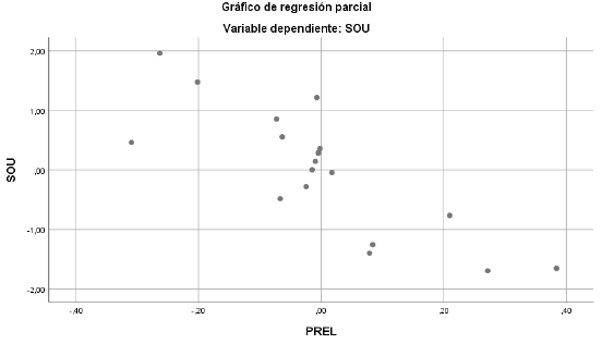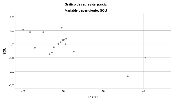 Algo similar ocurre para la variable procedimiento para transferir conocimiento, donde la relación baja de 0,5" a -0,538, lo que sugiere que la relación entre estas variables y SOU podría ser espuria. Sin embargo, al revisar los diagramas de regresión parcial para las variables PREL y PRTC en las Figuras 1 y 2, se evidencia una posible relación lineal negativa.