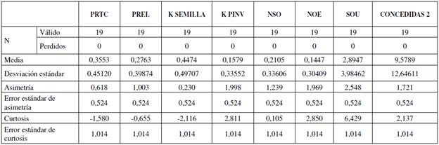 Como se observa en la Tabla 2, aunque las variables PREL y PRTC tuvieron una asimetría positiva, es decir, reflejan valores muy por encima de la media, presentaron una distribución platicúrtica, lo que también señala brechas en el estado de avance de estas en las IES de la muestra. En cuanto a las variables KPINV y NSO, aunque presentaron una media baja, el coeficiente de curtosis indicó que los valores se agruparon en torno a la media, lo que muestra una distribución leptocúrtica, esto sugiere un desarrollo "nivelado" del avance de estas variables en las IES, aunque con puntuaciones bajas.
