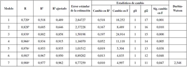 Para probar la relación propuesta se utilizó una regresión lineal múltiple. El método de selección de variables fue el escalonado en SPSS, teniendo en cuenta que este selecciona solo las variables con un nivel de significancia menor o igual a 0,05, asumiendo así un nivel de confianza del 95 %. La Tabla 2 informa las estadísticas descriptivas; y la Tabla 3 el nivel de ajuste para el modelo. En la Tabla 4, por su parte, se presenta la matriz de coeficientes.