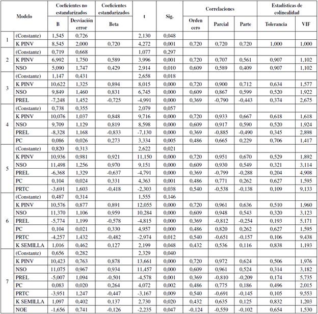 Como se observa en la Tabla 3, el estadístico Durbin-Watson tuvo puntuación de 2,548. Ello sugiere la no autocorrelación entre los residuos de los casos, el mayor cambio de bondad de ajuste se generó al tomar en cuenta las variables NSO y PREL, los coeficientes estandarizados indicaron que las variables KPINV, NSO y PREL obtuvieron la mayor importancia relativa dentro de la ecuación.