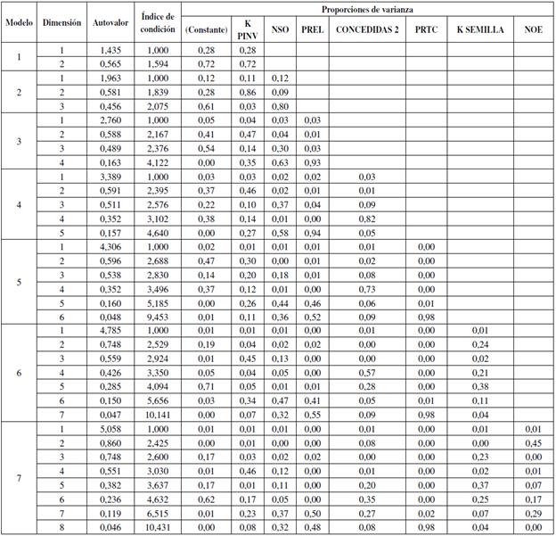 En la Tabla 4, el valor de tolerancia mayor a 0,1 y el factor de inflación de la varianza es menor a 10. En la Tabla 5, los índices de condición son menores a 15 para todas las variables, lo que sugiere que no se presentó colinealidad en el modelo. Al revisar la relación entre el número de SOU y la valoración del procedimiento para explotar licencia, esta vale 0,36. Sin embargo, al eliminar de estas dos variables el efecto atribuible al resto de variables independientes la relación baja hasta -0,810.