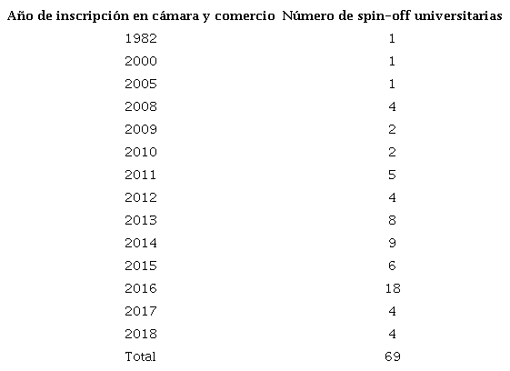 En línea con lo anterior, Moutinho y su equipo (2016) señalan en su investigación que el emprendimiento a través de empresas basadas en conocimiento se asoció de manera positiva con la actividad de patentes, la experiencia empresarial y la oportunidad de beneficios de comercializar la investigación. Sin embargo, resultados para Italia encontraron evidencias de que "la productividad científica de la universidad y la actividad de patentes no está relacionada con la propensión de la universidad a crear spin-off acadêmicas" (Ramaciotti y Rizzo, 2015, p. 509).