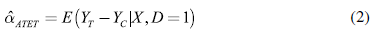 El estimador que se calcula con este método es el efecto promedio del tratamiento sobre los tratados (average treatment effect on the treated) y se representa según se indica en la ecuación 2.