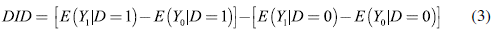Este modelo estima la diferencia de la variable de resultado entre los individuos del grupo de tratamiento y el de control, un tiempo después de que el grupo de tratamiento hubiera estado expuesto al programa, pero tiene en cuenta la diferencia de dicha variable entre los dos grupos, antes de la implementación del programa. En otras palabras, el efecto del programa se calcula como la diferencia de la variable de resultados entre los grupos de interés, después de 18 meses de iniciado el programa, a lo cual se resta la diferencia de esa misma variable entre los dos grupos en la línea de base (ecuación 3).