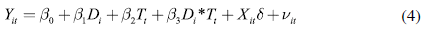 Donde YIt es el valor de la variable de interés para el individuo i en el periodo t; D¡ indica si el individuo i es del grupo de tratamiento o control; Tt indica el periodo de tiempo (línea de base y línea de salida); Xit corresponde a un conjunto de variables observables del individuo i; y vit es el error. El parámetro de interés que mide la doble diferencia o impacto del programa es