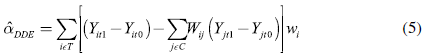 es el estimador de doble diferencia emparejado; Yit1 es la variable de resultado en el periodo posterior a la exposición al programa; Yit0 es la variable de resultado en la línea de base; i corresponde con individuos del grupo de tratamiento; j corresponde con individuos del grupo de control; Wij es la matriz que describe la relación entre las parejas i y j de los grupos de tratamiento y control.