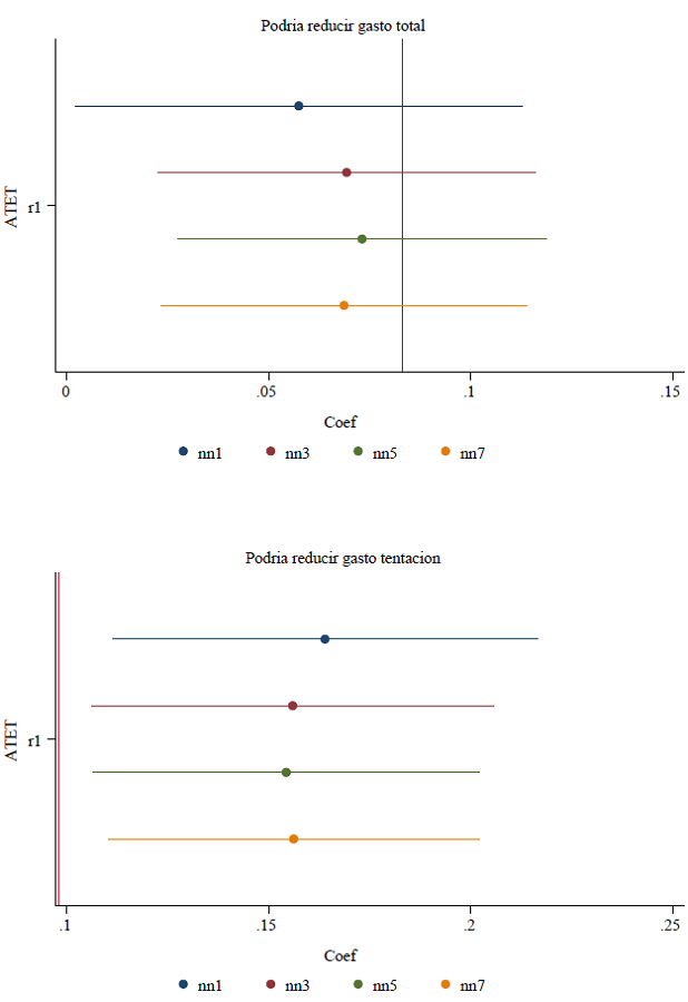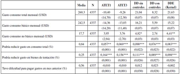 Los resultados revelan que el gasto reportado por los hogares del grupo de tratamiento es similar al del grupo de control, para el gasto total y gasto en consumo de bienes básicos o necesarios, con todos los modelos usados. Sin embargo, los hogares tratados reportan un aumento de pequeña magnitud en el gasto de consumo de bienes no necesarios o de tentación, lo que resulta ser significativo solo para los modelos de DD sin controles y DDE. Los coeficientes de los demás modelos también son positivos, pero tienen una mayor varianza.