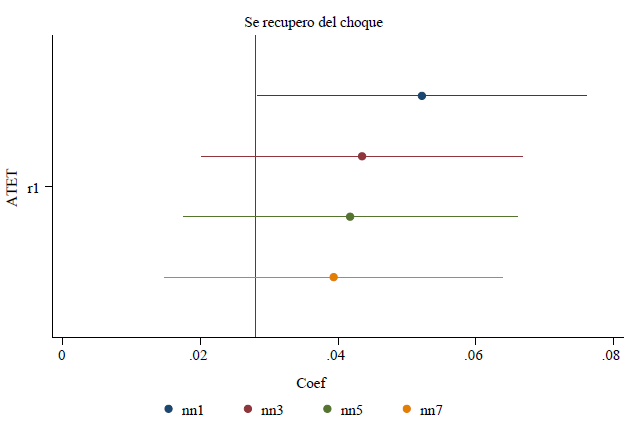 La Tabla 5 muestra los resultados de las estimaciones para estas variables. La columna 1 muestra los coeficientes estimados con el modelo de emparejamiento siguiendo el algoritmo del vecino más cercano (ATET1). La columna 2 muestra los coeficientes del modelo de emparejamiento con tres vecinos más cercanos (ATET3). Las columnas 3 y 4 muestran los coeficientes de estimar el modelo de diferencia en diferencia sin y con variables de control, respectivamente (DD sin controles y DD con controles). Finalmente, la columna 5 describe los resultados de estimar el modelo de diferencia en diferencia emparejado usando una estimación Kernel para el emparejamiento de los controles y tratados (DDE Kernel)8.